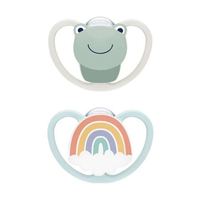 Smoczek uspokajający Space posiada ulepszony anatomiczny kształt wzorowany na kształcie brodawki sutkowej matki w czasie karmienia piersią, optymalnie dostosowuje się do jamy ustnej dziecka w czasie ssania. Bardziej spłaszczona i gładka od spodu gumka to przyjemne odczucie w buzi i więcej miejsca dla naturalnych ruchów ssących.Duże otwory wentylacyjne zapewniają jeszcze lepszą cyrkulację powietrza, pozwalają delikatnej skórze dziecka oddychać bardziej efektywnie, idealny dla wrażliwej skóry dziecka. Cieńsza i węższa szyjka smoczka zmniejsza nacisk na szczękę i zęby. W zestawie znajduje się wytrzymałe pudełko wielokrotnego użytku do bezpiecznego i czystego przechowywania. Unikalne wzory i kolory. Opakowanie zawiera 2 sz. silikonowych smoczków 0-6m wraz z pudełkiem. Wymiary/waga: wymiary opakowania (dł. x wys. x gł.)[cm]: 6x14x5, waga produktu w opakowaniu [kg]: 0,03 kg. Produkt przeznaczony dla dzieci w wieku: 0-6m. Pakowany w pudełeczko z zawieszką. Wyprodukowano w Niemczech.