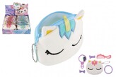 Peněženka dívčí jednorožec semiš 12x10cm s doplňky do vlasů 2 barvy v sáčku 16ks v boxu