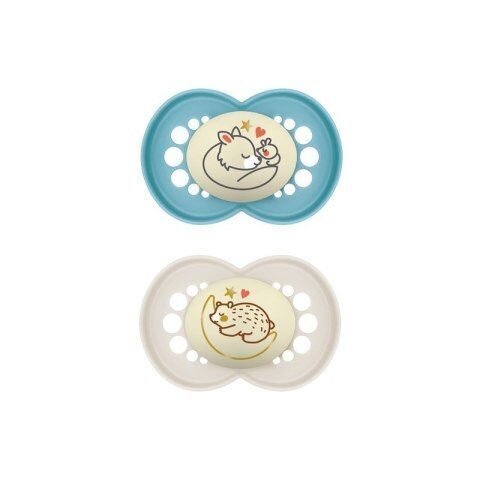 Original Night - Smoczek Cechy: -Smoczek świecący w ciemności - łatwo odnaleźć jego świecący guzik -Przyjazny dla skóry dzięki dużym otworom przepuszczającym powietrze i wyjątkowej warstwie wewnętrznej opracowanej przez MAM -Ortodontyczny -Wykonany z silikonu MAM SkinSoft™ lub naturalnego kauczuku -Uspokaja i zapewnia dziecku poczucie komfortu -Sprzedawany w praktycznym pudełku do sterylizacji i przechowywania, umożliwiającym wygodną i szybką sterylizację w kuchence mikrofalowej Wiek: 6m+