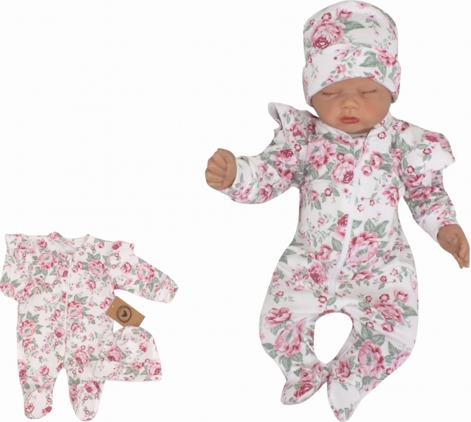 Z&Z 2-dílná soupravička overálek se šlapkama + čepička, Růže bílá, růžová, vel. 68