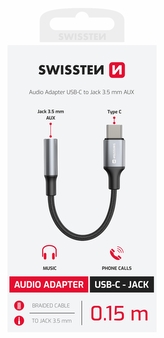 AUDIO ADAPTÉR SWISSTEN TEXTILE USB-C (samec) / 3,5mm AUX 0,15 M ČERNÝ (nahrazuje 73501301)