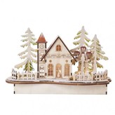 LED dekorace dřevěná – zasněžený kostel, 15 cm, 2x AA, vnitřní, teplá bílá, časovač