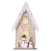 LED dekorace dřevěná – domek se sněhuláky, 28,5 cm, 2x AA, vnitřní, teplá bílá, časovač