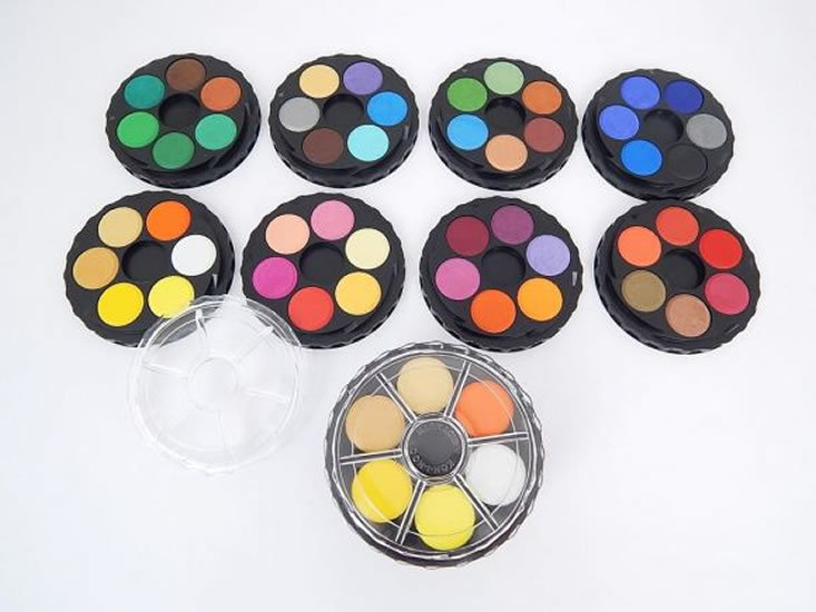 Souprava obsahuje klasické vodové barvy v praktických kulatých tabletkách o průměru 22,5 mm, které jsou ideální pro precizní i volnější malbu. Barvy jsou dodávány v sadách po 6, které lze snadno stohovat, což umožňuje přehledné uložení a rychlý přístup k barvám. Tento design pomáhá udržet vaši pracovní plochu organizovanou a vaše tvoření bez stresu.