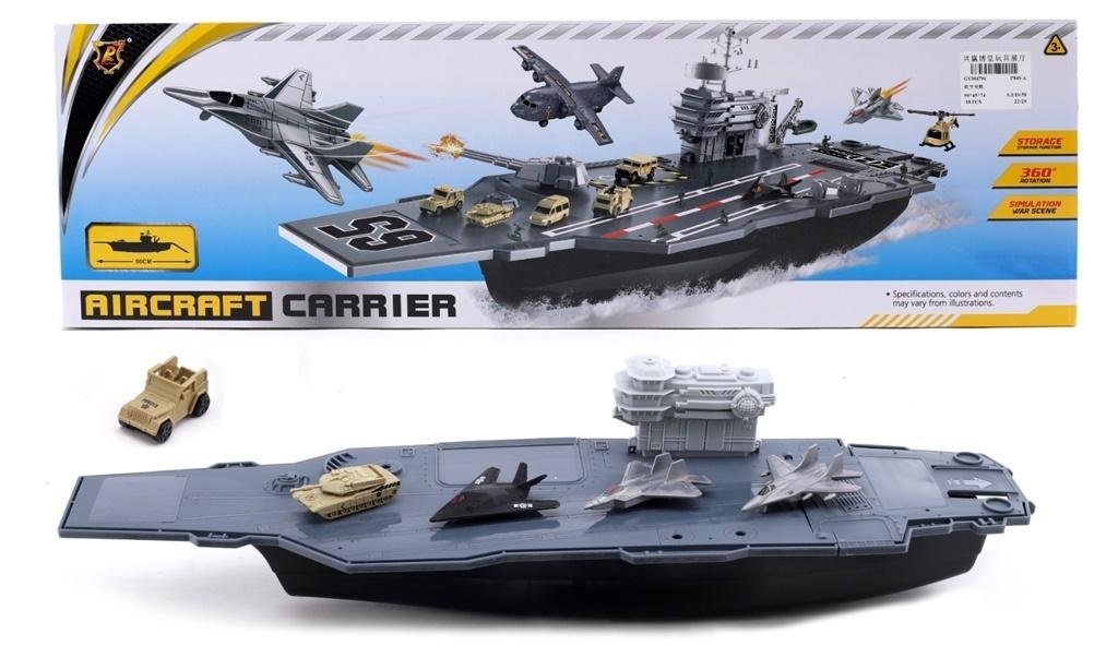 W ZESTAWIE: LOTNISKOWIEC 86 CM., 3 SAMOLOTY, CZOŁG, WÓZ BOJOWY, RAMPA Z PODJAZDEM, NAKLEJKI, FUNKCJE: OBROTOWE DZIAŁO, OBROTOWY DŹWIG, UCHYLNA KLAPA W POKŁADZIE, 3+