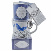 Dárková sada, Vanilková káva 19 g, hrnek s motivem květin a motýla, 200 ml, plechová dóza se skořicovými tyčinkami 6 g a lžička