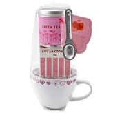 Dárková sada, Zelený čaj 6 g, bílý keramický hrnek se srdíčky 300 ml, sušenky 15 g, lžička