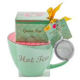 Dárková sada, Zelený čaj 6 g, zelený keramický hrnek s nápisem 300 ml, sítko