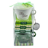 Dárková sada, Zelený čaj 3 g, Černý čaj 3 g, 2 x keramický hrnek s nápisem 200 ml, sušenky 9 g, lžička