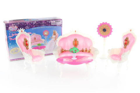 Glorie luxusní obývací pokoj obsahuje pohovku (23 x 13 x 17,5 cm), 2 křesla (10 x 120 x 9 cm), konferenčí stoleček (16,5 x 8,5 x 7,5 cm), zrcadlo (9 x 21 x 5,5 cm) a vázu s umělou květinou. Součástí je také korunka a žezlo pro panenku. Výrobek je z plastu. Panenka není součástí balení. Rozměr...