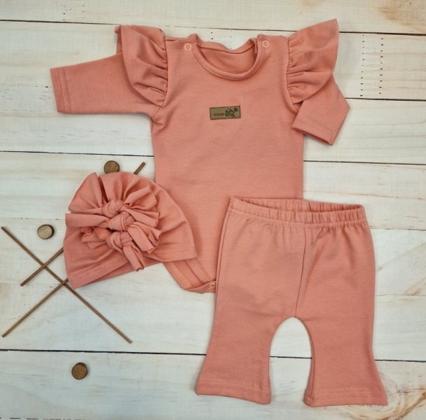 Body s volánky, legíny do zvonu a čepička, 3D, bavlna, meruňková, vel. 86; 86 (12-18m)