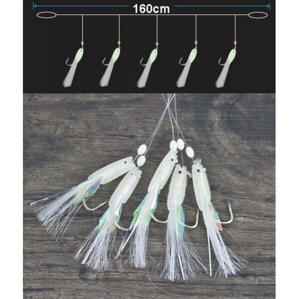 Systém pro lov makrel spěti háčky. Nad háčkem jsou bílé korálky a na háčku je bílá imitace rybí hlavičky a fluorescenční folie s bílými střapci.