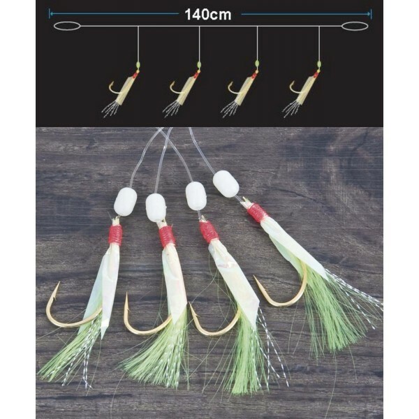 Systém pro tresky tmavé a tresky obecné se čtyřmi zlatými háčky. Slídové tělo je imitace rybí kůže.