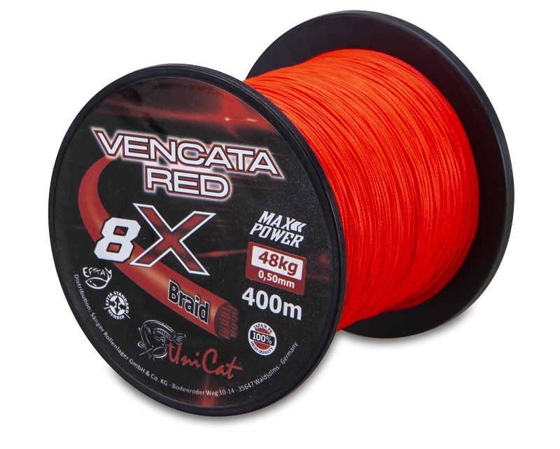 Při výběru pletené šňůry na sumce nemůžete dělat kompromisy. Extrémně vysoká pevnost v tahu, extrémně vysoká odolnost proti oděru a dobrá pevnost v uzlu jsou absolutní nutností! Naše Vencata Red je špičková osmipramenná šňůra, která byla vyvinuta a testována přímo sumcaři a vyrobena nejlepšími světovými specialisty na šňůry. Před opuštěním výrobního závodu je nosnost počítačově testována a teprve potom je šňůra zařazena do prodeje. Těsné opletení zabraňuje absorbování vody a současně vám umožňuje nahazovat do větší vzdálenosti, což může být právě při lovu sumců klíčové. Nulovou průtažnost jistě ocení rybáři, kteří preferují lov na trhačku nebo s podvodním splávkem. Díky nápadné fluo barvě víte, kde se vaše nástraha právě nachází, a to i v šeru nebo v dešti.
