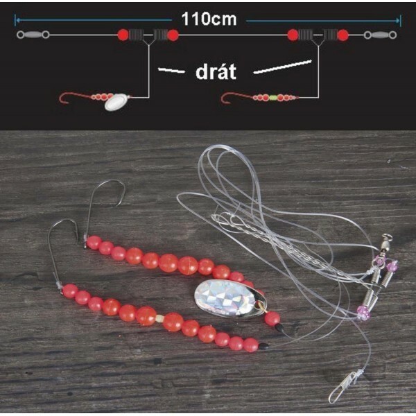 Hlavní vlasec je osazen dvěma háčky 2/0, jsou umístěny na ocelovém rameni, které dovoluje nástraze rotovat okolo vlasce bez zamotání. Systém je vybaven několika bílými korálky a třpytkou. Je neodolatelný pro všechny druhy platýsů.
