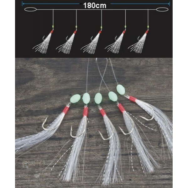 Systém pro lov makrel s pěti háčky. Červeno bílá barva je lákavá. Nad háčkem jsou fluorescenční korálky a na háčku jsou stříbrné střapce.