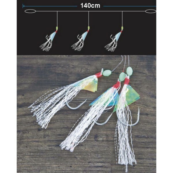 Systém pro velké tresky obecné a tresky tmavé, se třemi ocelovými háčky, bílými střapci a reflexní páskou.