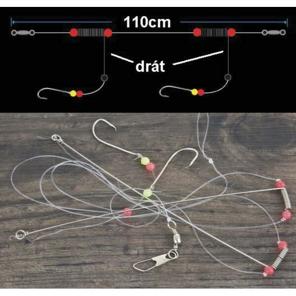 Hlavní vlasec je osazen dvěma háčky 2/0, jsou umístěny na ocelovém rameni, které dovoluje nástraze rotovat okolo vlasce bez zamotání.5310010, 110cm, 2/0, 0,60mm
