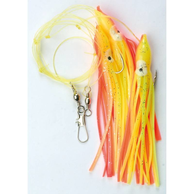 Návazcový systém, imitace chobotnice.A:5405009, oranžová / žlutá, 3/0, 160cm / 0,70mmB:5405011, fluoro světle zelená, 3/0, 160cm / 0,70mmC:5405012, fluoro žlutá / červená, 3/0, 160cm / 0,70mm