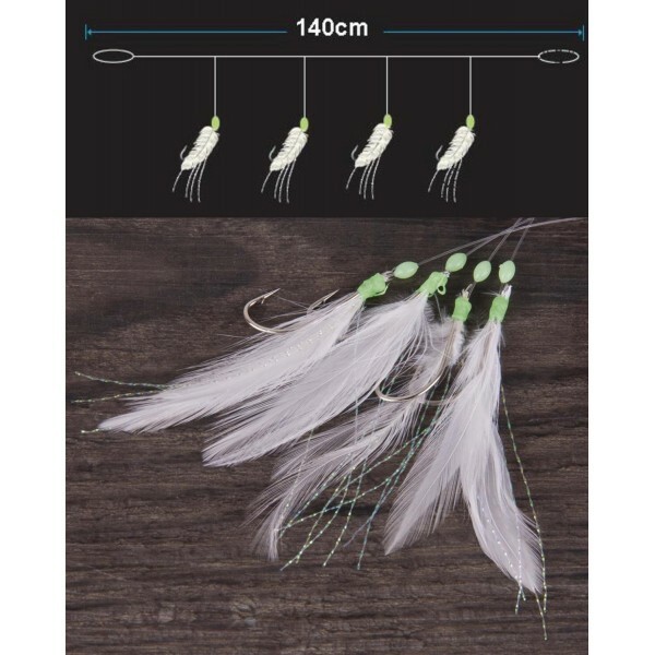 Systém pro lov makrel se čtyřmi háčky. Bílá barva je lákavá. Nad háčkem jsou fluorescenční korálky a na háčku je bílé peří se stříbrnými střapci.