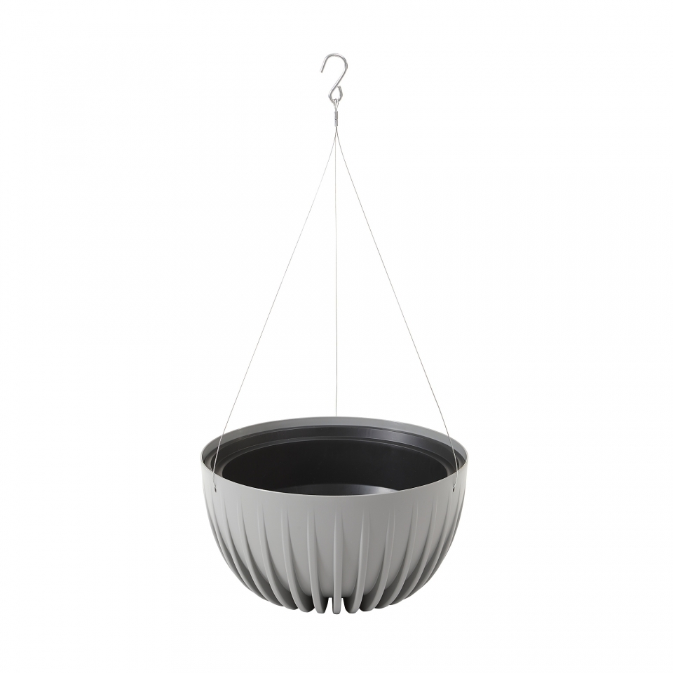 Plastová mísa z kolekce Mira s lankem na zavěšení. Moderní mísa s žebrováním. Součástí květináče je černý plastový vklad sloužící k odtoku přebytečné vody pod tento vklad.