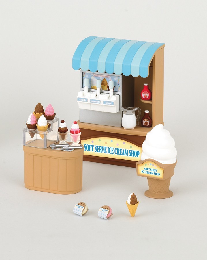 Obchod s točenou zmrzlinou Stánek s točenou zmrzlinou nabízí velký výběr , kde vám v mžiku natočí do vašeho kornoutku tu správnou zmrzlinku. Sada obsahuje stánek, pult, stroj na zmrzlinu, zmrzliny ( nejsou určeny k jídlu), kornoutky a poutač na zmrzlinu. Figurky nejsou součástí balení. Rozměr balení: 12,8 x 9,8 x 7,3 cm Vhodné pro dědi : 3+