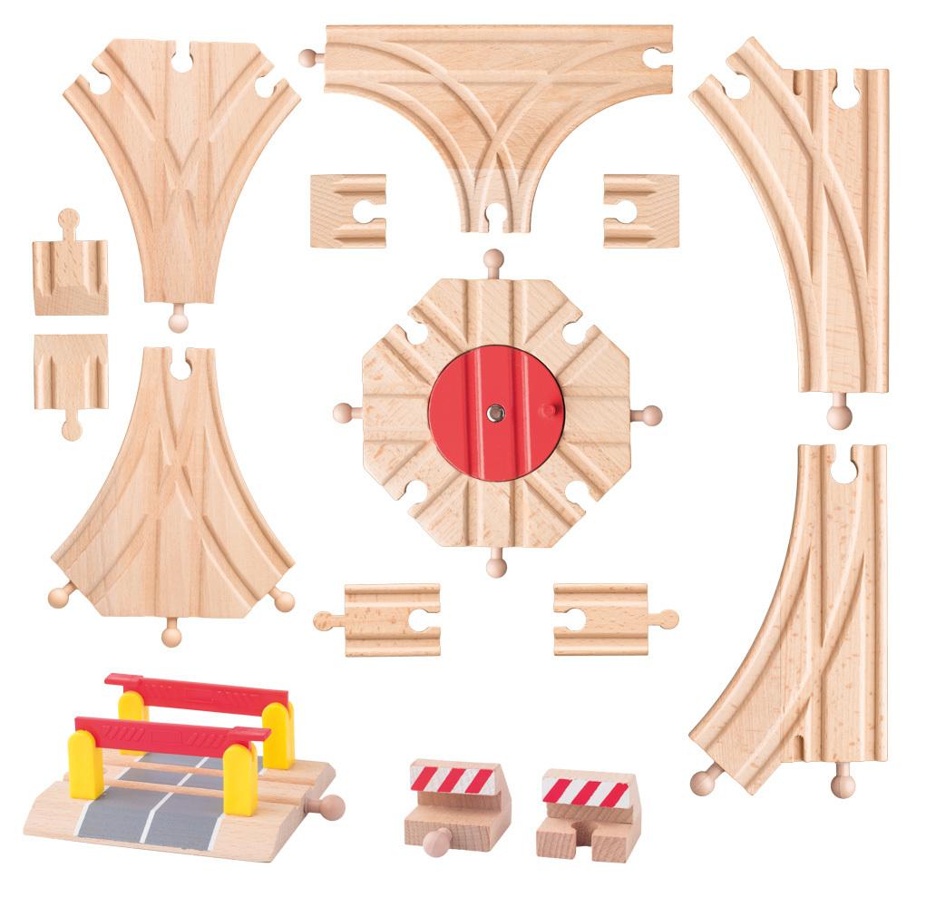 Příslušenství k vláčkodráze  - set kolejí, výhybky, točna, koncovky, přejezd se závorami. Díky této sadě můžete vymýšlet nové možnosti na trati. Koleje jsou vyrobeny z kvalitního dřeva a vynikají perfektním zpracováním. Věk: 3+. Rozměr produktu: 33,5 x 8 x 19 cm číst celé