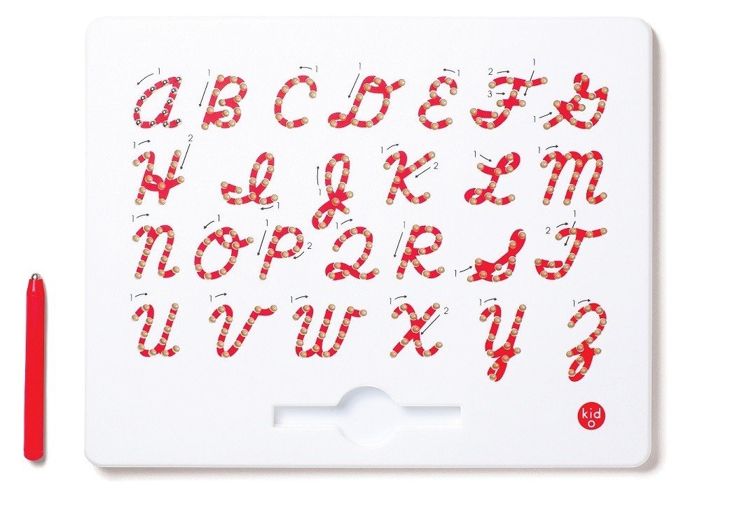 Kid O magnetická tabulka pro nácvik správného psaní velkého psacího písma složená z magnetických kuliček a pera. Dítě prostřednictvím nakreslených šipek obkresluje magnetickým perem linii písmene správným směrem. Díky působicí síle mezi magnety dítě cítí a slyší, jak vyskakují magnetické kuličky směrem k tužce, a tím se vytváří správný tvar písmene. Tabulka je tak nejen vynikající výukovou pomůckou, ale také zabavou pro děti! Magnety spadnou přetřením tabulky dlaní nebo plochou tužky a dítě může začít znovu! Vhodné pro děti od 6 let. (Nepoužívejte pro děti mladší 3 let, obsahuje malé části!) Rozměry: 30 x 24 x 1,5 cm. (Kid O je americká firma, jedná se tedy o americký styl psaní!) Kid O Společnost Kid O je americká firma, která věří, že děti se nejvíce baví, když objevují nové věci, neboli jinými slovy, že pro děti je hra vlastně učením se něčeho nového. Právě z tohoto důvodu jsou všechny výrobky této firmy navrženy tak, aby nabízely co nejvíce možností k rozvoji. Jejich hračky neustále podporují a stimulují děti množstvím svých tvarů, barev a velikostí, a tak jsou možnosti pro kreativní hru opravdu neomezené. Když si děti hrají s výrobky Kid O, posilují vlastní představivost, čímž zapojují dovednosti, které budou potřebovat pro běžný život. Společnosti Kid O dbá na to, aby byly všechny její výrobky bezpečné, proto jsou testovány nezávislou laboratoří. Každý produkt vyhovuje US ASTM F 963-07 standardům a EN-71 evropským standardům. Všechny obaly, které firma používá jsou ze 100% recyklovatelných materiálů. Jak fungují jejich magnetické tabulky? Podívejte se na toto video: