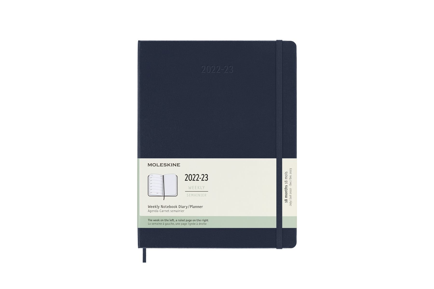 Extra velký modrý plánovací zápisník na rok 2022-23. Diář je datovaný od července 2022 do konce roku 2023. Na levé straně jsou dny v týdnu a na pravé linkovaná stránka na poznámky. Diář má měkkou vazbu v kartonových deskách. Obepíná ho pružná páska proti samovolnému otevírání. Obsahuje praktickou vnitřní kapsu, textilní záložku a barevné samolepky. Papír s gramáží 70 g/m2 neobsahuje kyseliny.