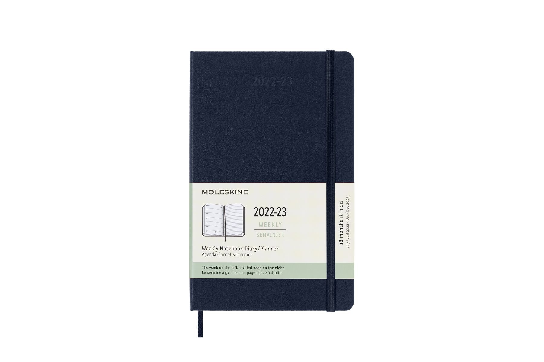 Velký modrý plánovací zápisník na rok 2022-23. Diář je datovaný od července 2022 do konce roku 2023. Na levé straně jsou dny v týdnu a na pravé linkovaná stránka na poznámky. Diář má pevnou vazbu v kartonových deskách. Obepíná ho pružná páska proti samovolnému otevírání. Obsahuje praktickou vnitřní kapsu, textilní záložku a barevné samolepky. Papír s gramáží 70 g/m2 neobsahuje kyseliny.