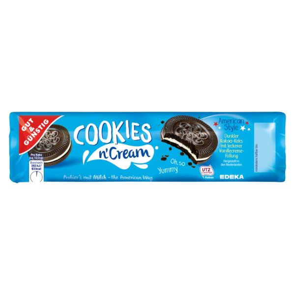 GG Cookies&Cream sušenky s vanilkovou náplní 176gVynikající kakaové sušenky na způsob Oreo - slepované lahodným vanilkovým krémem. Ideální ke kávě, čaji nebo ke sklenici mléka. Použité kakao je z udržitelného pěstování - Certifikace Rainforest Alliance. číst celé