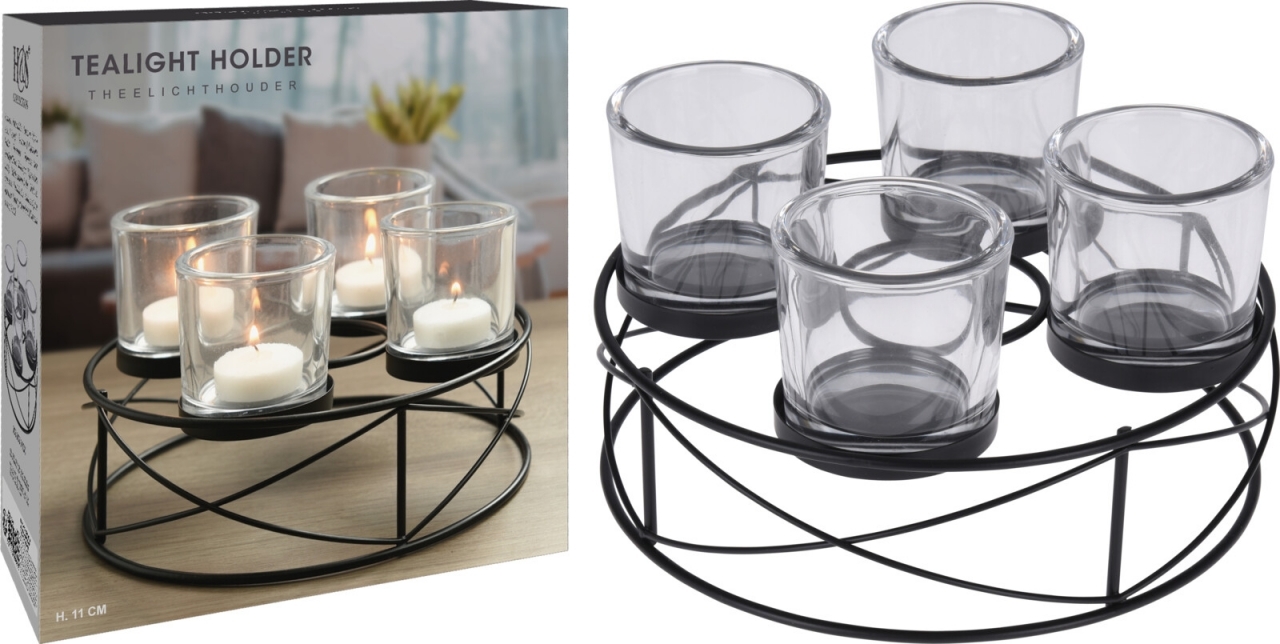 Kovový svícen se skleněnými kalíšky na 4 čajové svíčky.