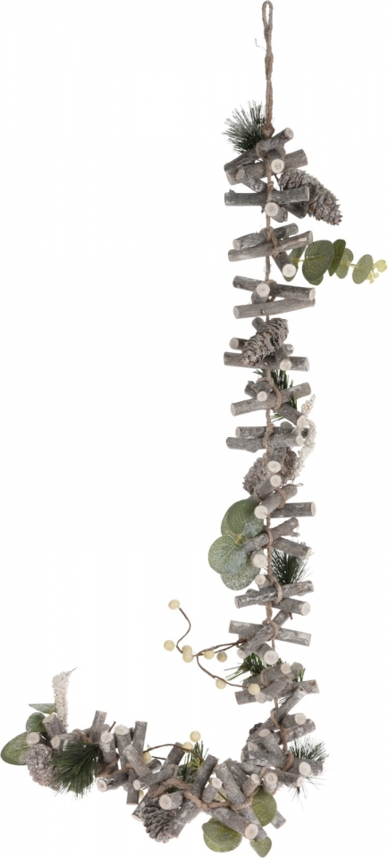 Dekorativní dřevěná girlanda na zavěšení z dřívek. Girlanda je zdobená šiškami, bobulkami, eukalyptem a umělým chvojím borovice a jedle, zasněžený umělým sněhem.