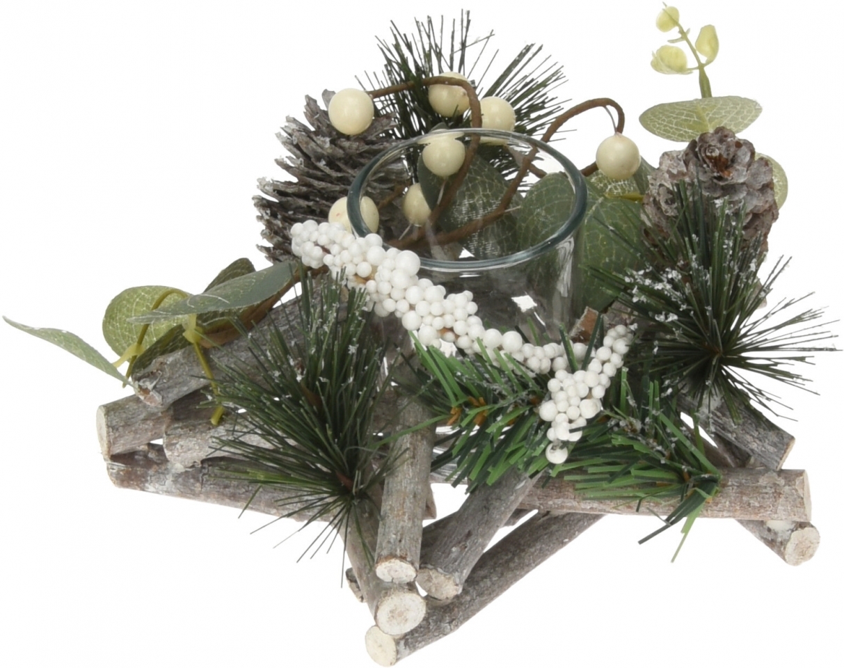 Dekorativní dřevěný svícen z dřívek ve tvaru hvězdy. Svícen je zdobený šiškami, bobulkami, eukalyptem a umělým chvojím borovice a jedle, zasněžený umělým sněhem. Součástí je skleněný kalíšek na svíčku.