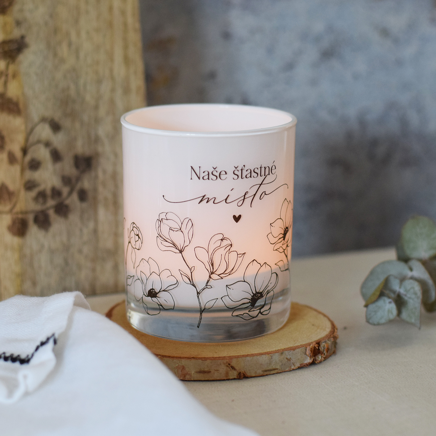Svícen z mléčného skla zdobený trendy květy magnólie doladí váš interiér nebo jej můžete věnovat jako originální dárek.