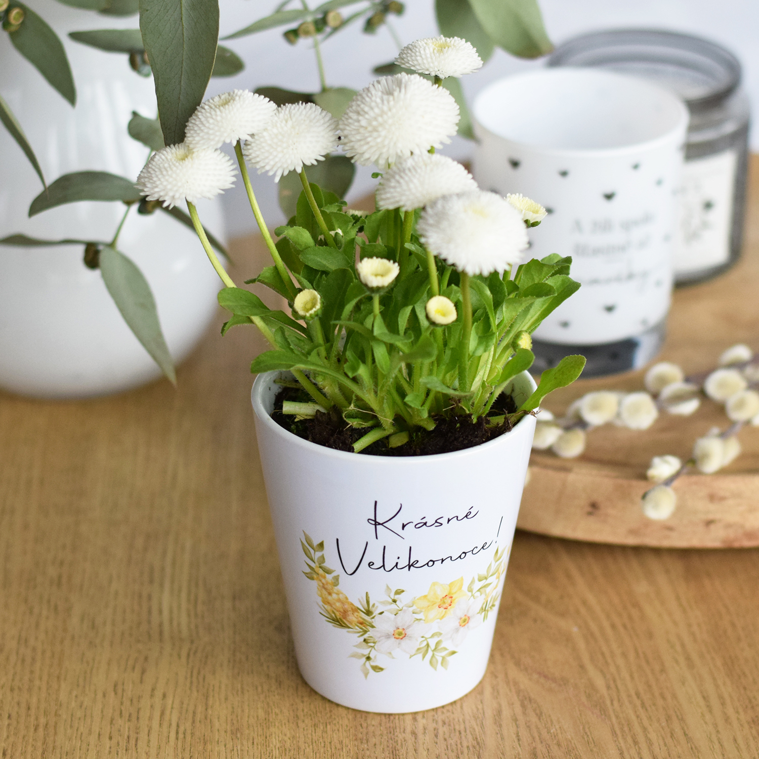 Keramický květináč s přáním krásných Velikonoc je nezbytností v tomto jarním období.