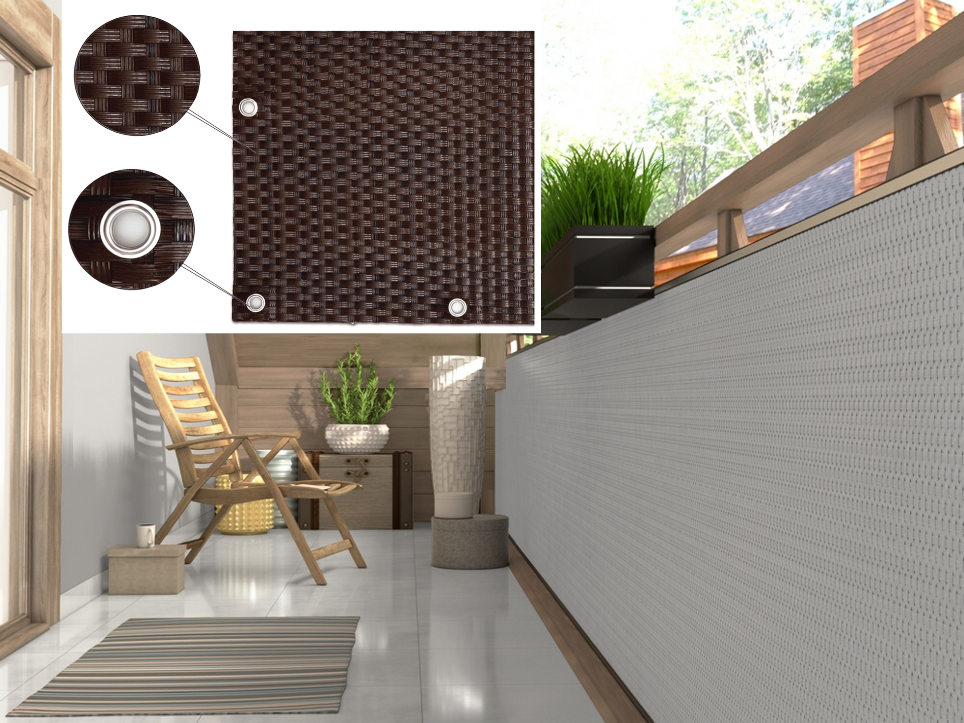 Krycí balkonová zástěna z umělého ratanu je ideálním doplňkem Vašeho balkonu. Je praktickou ochranou před větrem, je odolná vůči povětrnostním vlivům a UV záření. Pokud toužíte po soukromí před nežádoucími pohledy zvědavých sousedů je zástěna Vaše ideální volba. Balkonová zástěna je nabízena v různých rozměrech. Je vyrobena z pevného materiálu se 100 % stíněním, je vodotěsná a velmi odolná. Doporučujeme na balkon, zahradu nebo terasu. 1300 g/m2. Možnost zkrátit na libovolnou délku, materiál se netřepí a netrhá.