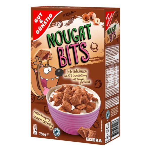 GG Nougat Bits plněné polštářky s krémovou náplní 750gKřupavé cereální polštářky se 42% krémovou náplní s nugátovou příchutí. Kromě jejich neodolatelné chuti navíc obsahují vlákninu. Zejména s čerstvým mlékem jsou neodolatelné a perfektně se tak hodí pro rychlou přípravu snídaně či svačiny.Praktické balení - uzavíratelný sáček - cereálie vydrží déle čerstvé.Certifikace Rainforest Alliance: kakao z udržitelného pěstování.