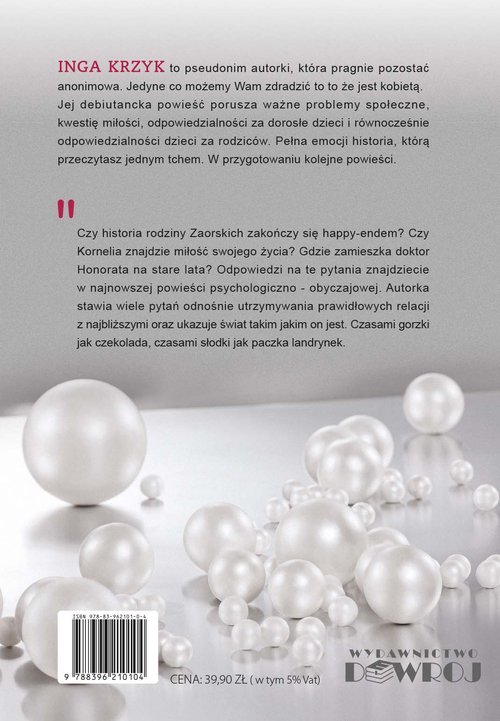 Debiutancka powieść Ingi Krzyk porusza ważne problemy społeczne, kwestię miłości, odpowiedzialności za dorosłe dzieci i równocześnie odpowiedzialności dzieci za rodziców. Pełna emocji historia, którą przeczytasz jednym tchem.