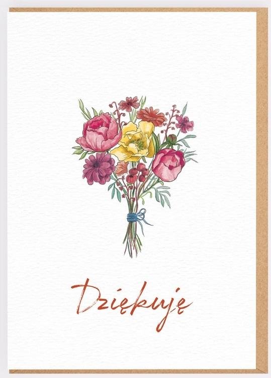 Klasyczny wzór z bukietem polskich kwiatów poleca się jako dodatek do prezentu dla osoby, której należą się podziękowania. Kartka w zestawie z elegancką kopertą jest pusta w środku i została wydrukowana na papierze ekologicznym. Jej wnętrze czeka na wypełnienie treścią płynącą prosto z Twojego serca!