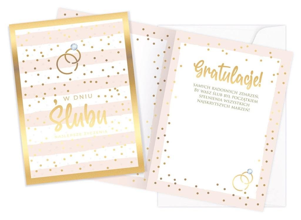 W powiększonym tzw. Angielskim formacie 140x190 mm. Wykonana z niezwykłą dbałością o szczegóły, zdobiona złotą, matową folią oraz lakierem UV dla podkreślenia wyjątkowości i elegancji. Wewnątrz znajduje się tekst życzeń, a całość uzupełnia dedykowana biała koperta. okazja: Ślub číst celé