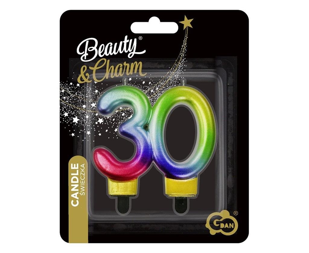 Świeczka liczba 30 urodziny, B&C, Galaxy, 7,5 cm Wysokość: 7,5 cm Kolor: tęczowy Ilość sztuk w opakowaniu: 1 Producent: Godan S.A. Kolekcja: Beauty&Charm Tęczowa świeczka na tort liczba 30 na trzydzieste urodziny rozpali urodzinowe emocje i zachwyci gości. Świeczka na tort w kształcie liczby 30 to piękna i elegancka ozdoba tortowa, na którą zasługujesz Ty oraz Twoi bliscy. Wygodne podstawki pozwolą Ci łatwo i wygodnie zamocować świeczkę na torcie lub w urodzinowym cieście. Dzięki nim świeczka cyfra 30 będzie także stabilnie stać i czekać na zdmuchnięcie przez solenizanta/solenizantkę. Świeczka na tort w kształcie liczby 30 tęczowa okaże się również niezastąpiona, jeśli szykujesz imprezę firmową, jubileusz lub rocznicę ślubu.