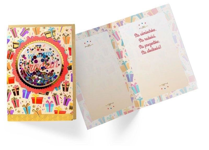 Co jest lepsze od pięknej kartki? Piękna kartka z gadżetem! Brokat, złote gwiazdki, cekiny, kolorowe kuleczki - każda kartka z nowej serii Konfetti Kukartka posiada element wypełniony odlotowym konfetti. Oprócz tego, kartki z tej serii są zabawne, kolorowe na zewnątrz i w środku, mają też dodatkowe dekoracje, w zależności od wzoru: tłoczenia, kolorowe folie metaliczne, elementy biżuteryjne, wstążeczki itp. Cechy szczególne: wielkość orientacyjna: B6, 16.6 x 11.7 cm po złożeniu, koperta: w zestawie, kolorowa, zdobienia: dekoracja wypelniona konfetti, dodatkowe (w zależności od wzoru: przyklejane dekoracje, elementy biżuteryjne, odstawniki, brokat metaliczne folie, tłoczenia itp.).