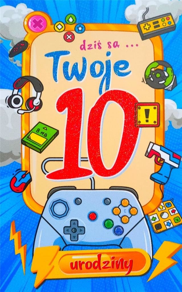 Karnet 2k. Klasyczny karnet na dziecięce urodziny. Uszlachetniony lakierem brokatowym. Karnet zawiera życzenia.