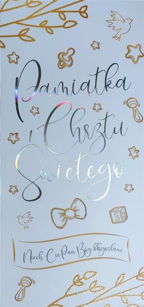 Klasyczny karnet na chrzest. Uszlachetniony lakierem brokatowym oraz wysokiej jakości złoceniem holograficznym. Karnet zawiera życzenia.Uwaga: karnet może różnić się kolorystycznie od zdjęcia.