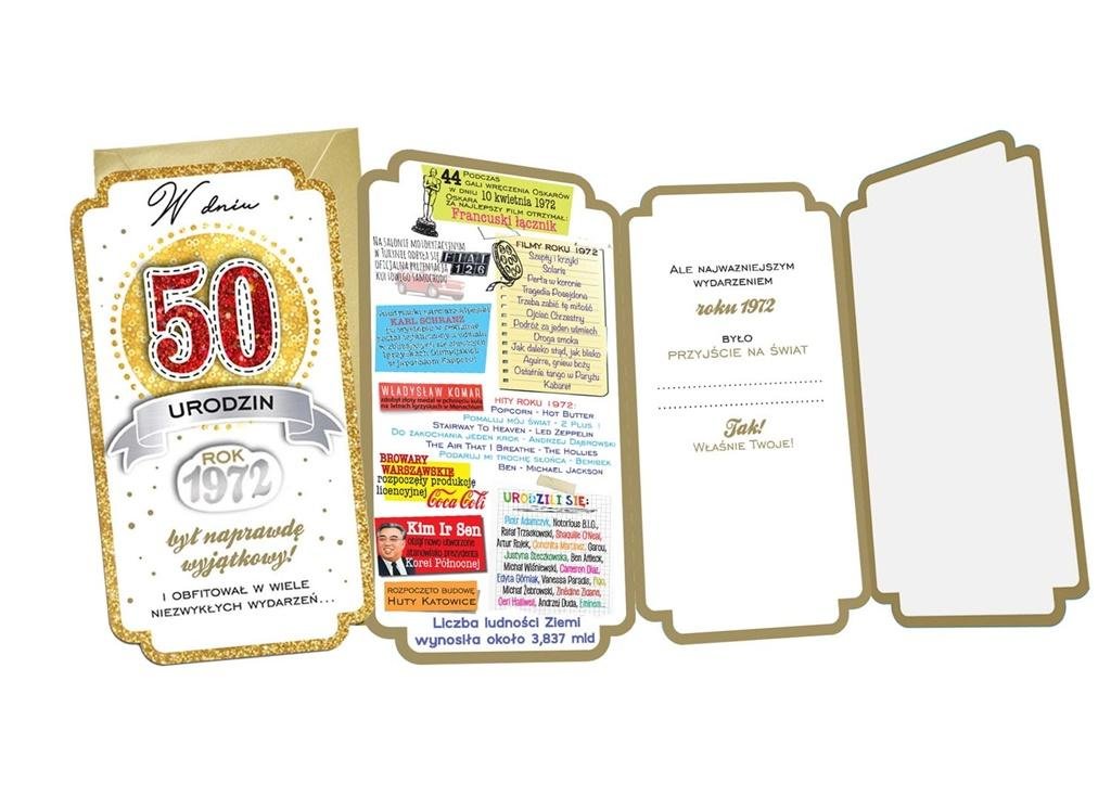 Kartka z serii Roczniki Passion Moments to zdobione kartki, w których w środku znajdują się ciekawe wydarzenia z danego roku. Na kartce znajdują się dekoracje ze złotej, srebrnej, perłowej lub holograficznej folii, a także doklejki biżuteryjne, kokardki, brokat, laserowe wycięcia, wstążeczki i inne dodatki. Wnętrze karnetu do zawsze atrakcyjna grafika i tekst życzeń. zdobienie: przynajmniej dwie folie (metaliczne/perłowe/holograficzne), brokat, elementy doklejane, wycięcia laserowe, wstążeczki - w zależności od wzoru, wnętrze: kolorowe, z delikatną grafiką, wyjątkowe życzenia w środku, w komplecie: dopasowana kolorystycznie koperta, okazja: 50 urodziny.