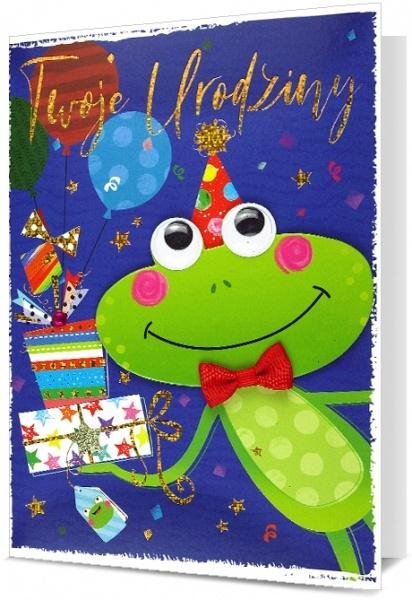 Wesoły i kolorowy urodzinowy karnet dziecięcy.Przestrzenne aplikacje, ruchome oczka, folia hologramowa, brokat. číst celé