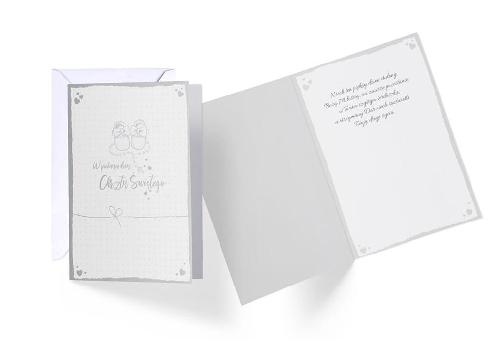 Karnet Vision w powiększonym tzw. Angielskim formacie 140x190 mm. Wykonane z niezwykłą dbałością o szczegóły, zdobione folią holograficzną i w całości pokryte folią matową dla podkreślenia efektu prostoty i elegancji. Wewnątrz znajduje się tekst życzeń, a całość uzupełnia dedykowana srebrna koperta.