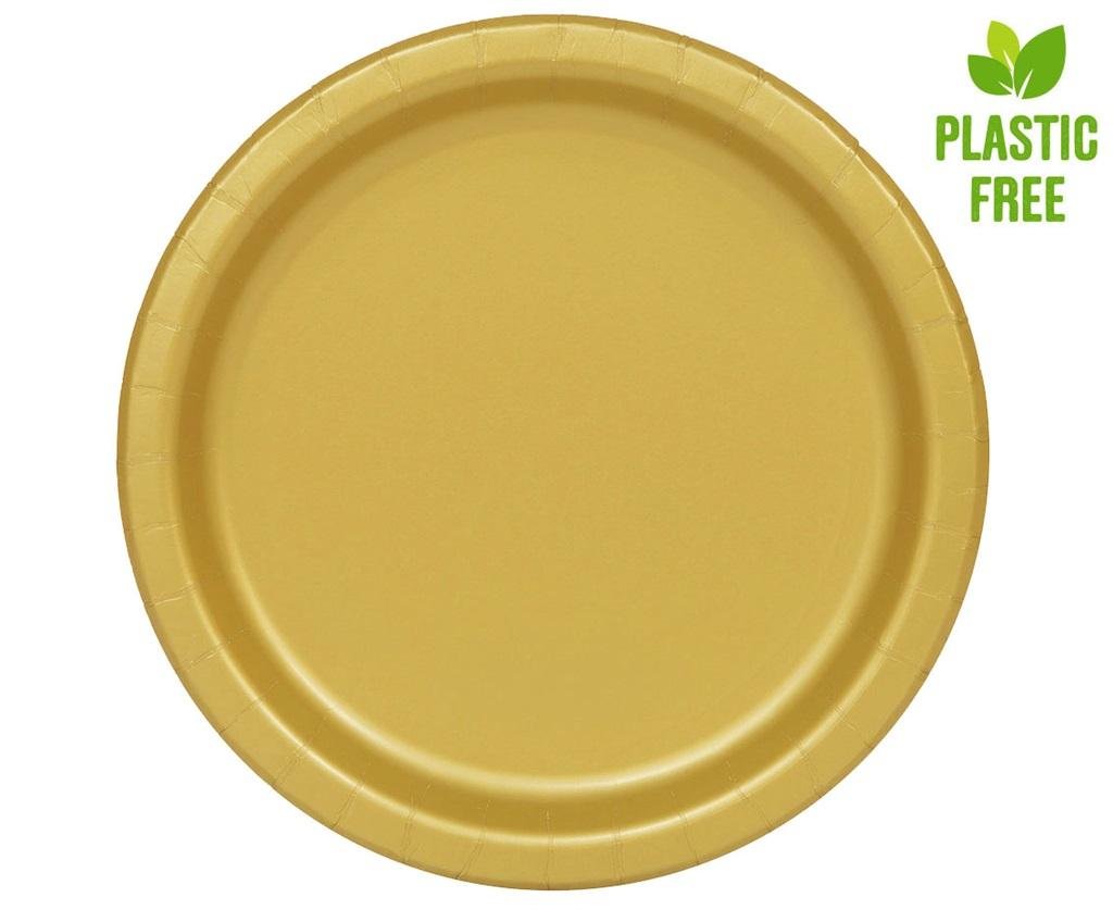 Talerzyki papierowe, złote, 23 cm, 8 szt. (plastic-free) Średnica: 23 cm Materiał: 100% papier Kształt: okrągły Kolor: złoty Nadruk: brak W opakowaniu: 8 szt. Producent: Unique Party Złote talerze papierowe są świetne zarówno do ciepłych, jak i zimnych dań. Użyj ich na urodzinowym przyjęciu, grillu, pikniku, imprezie Halloween i ciesz się ich zaletami. Talerzyki papierowe Unique są odpowiednio usztywnione, dzięki czemu jedzenie nie zsunie się na podłogę, gdy będziesz podawać je gościom :) Talerzyki nie zawierają ani grama plastiku. Jedz ze smakiem i dbaj o Naturę.