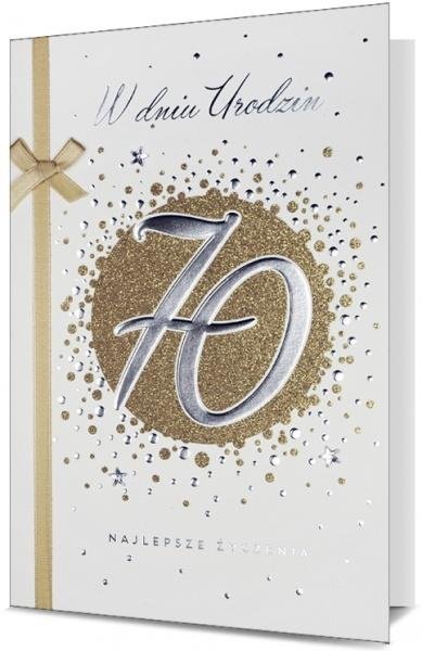 Ozdobny karnet urodzinowy z życzeniami i kopertą z kolekcji Hand Made. Bogato zdobiony mieniącym, złotym brokatem i przestrzennymi elementami. číst celé